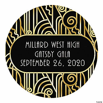Jazz your party favors and treat bags up in Jass-Age style with these 20s personalized stickers. 1920s parties are all the rage, and these stickers are perfect party supplies to give a little more glam to your event. They’re also perfect for 20s theme weddings, birthday parties and costume contests. Throwing a 20s-style prom or dance? These stickers are must-have party accessories that will make your event the stuff of legend! Personalize 3 lines with your own text. (144 pcs. per unit) 2″ diam. Character count on each line will vary depending on font style and font size. ยฉ OTC
