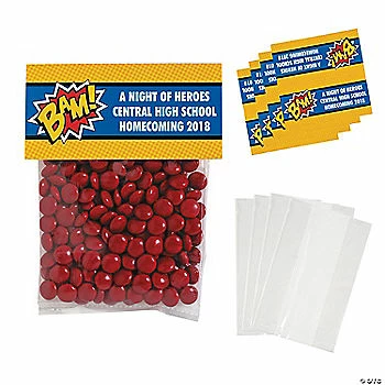 • Personalize It!: Personalized packaging adds unforgettable style to your event and makes your guests feel festive and appreciated.• Say Thanks with Sweets: Are you looking for an easy way to thank the people in your life? These multipurpose bags filled with great snacks are a sweet way to spread appreciation among party guests, students and teachers, or employees!• Easy to Assemble: Fill these goodie bags with your own awesome giveaways and toothsome treats, then simply staple them shut. No muss, no fuss, and loads of fun for your celebration!Product Description:Save the day with DIY party favor bags! Each cellophane bag features a vintage comic-style display card that reads “BAM!” and your own personalized message. These party favor bags are great for a superhero-themed prom, homecoming, corporate event, or birthday party. Just fill the bags with your own party favors, fold the personalized card in half, and staple the card to the top of the bag to seal it. Personalize with 3 lines of 20 characters/spaces per line. Simple assembly required. Size: Bags, 4″ x 5 1/2″; folded cards, 4 3/4″ x 2 1/4″ Quantity: 50Material: Cellophane and cardstock© OTC© OTC