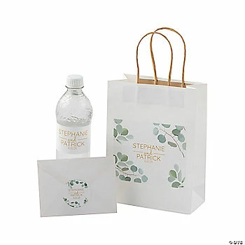 Greet out-of-town wedding guests with these customized gift bags! A beautiful way to thank them for traveling to help you celebrate your special day, this bag comes with a sticker to decorate the bag itself, plus stickers to place on water bottles and party favors. You might also add other gifts, like candles, fuzzy socks (perfect for winter weddings!), candies and other treats (all sold separately). Personalize stickers with 3 lines of text. Includes 12 each of bags and stickers. Paper bags, 6 1/2″ x 3 1/4″ x 9″; vinyl bag stickers, 5 1/2″ x 4 1/2″; water bottle labels, 9″ x 2″; favor stickers, 2″ diam. Simple assembly required to apply personalized sticker. ยฉ OTC