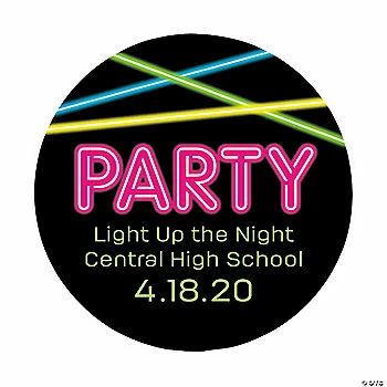 Letโs get glowing! These Personalized Glow Favor Stickers are the perfect accessory to hand out at a glow-themed prom, post-prom party, homecoming dance, corporate event or other special occasion. Make sure you have plenty of glow sticks and glow jewelry around to make the dance floor really stand out with the flashes of light. Personalize with three lines of text. Vinyl. (144 pcs. per unit) 2″ diam. ยฉย OTC