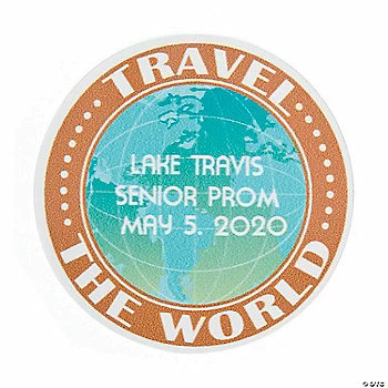 Your party favors, treat bags and other celebration goodies will have an around-the-world chic with these personalized stickers. Proms, homecoming dances, corporate events and bon voyage graduation parties will be even more special when you add these stickers to your supplies. Personalize with 3 lines of 18 characters/spaces per line. Paper. (144 pcs. per unit) 2″ © OTC
